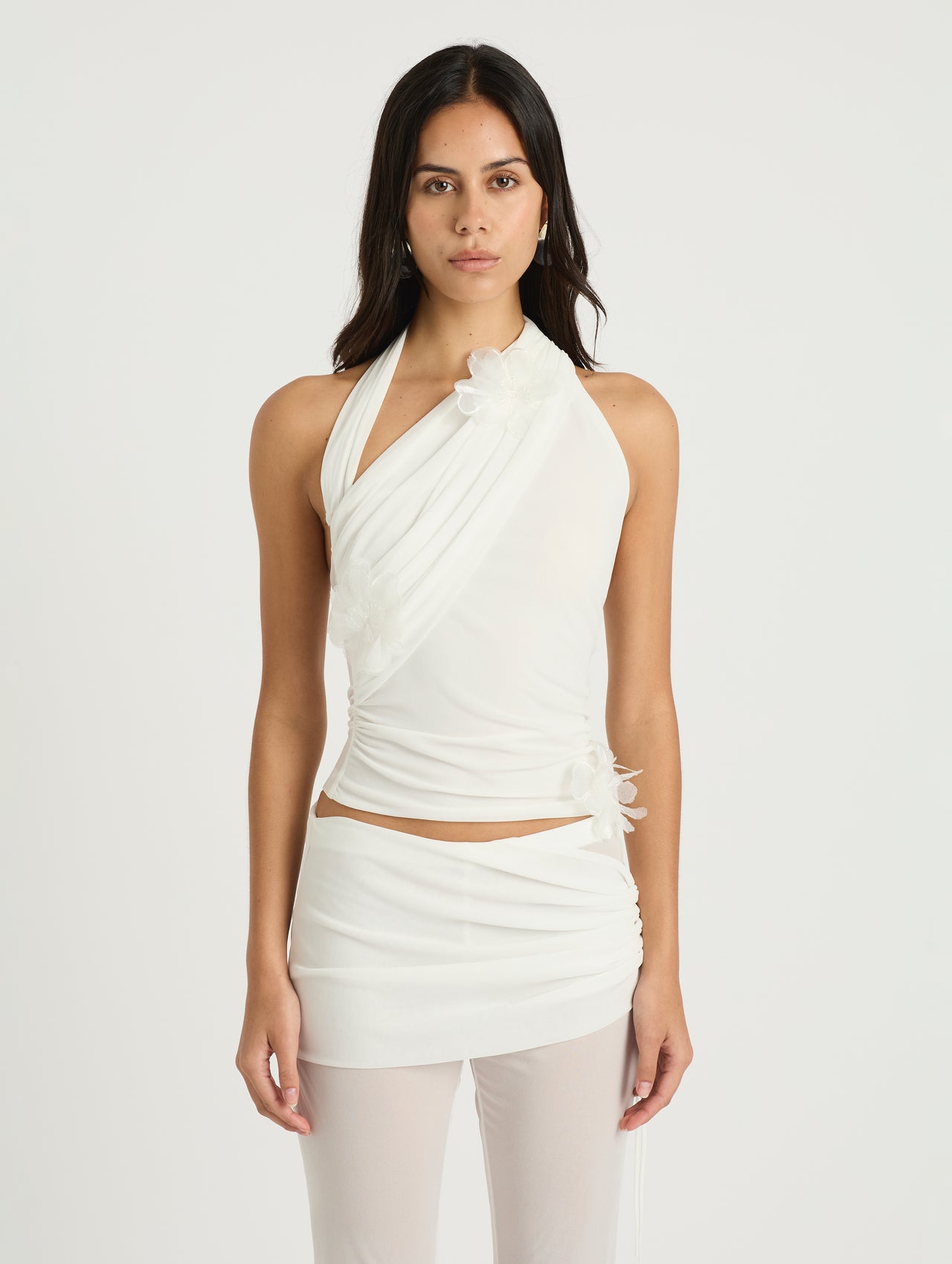 The Perry Top features an asymmetrical halter neckline in sheer fabric with floral detailing. Soft ruching defines the shape.